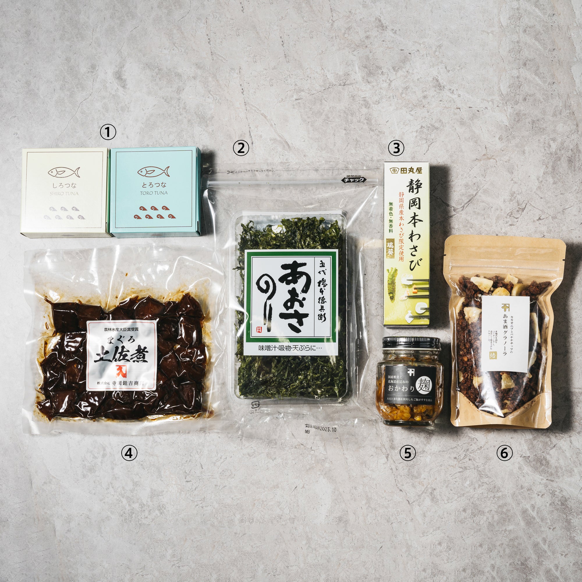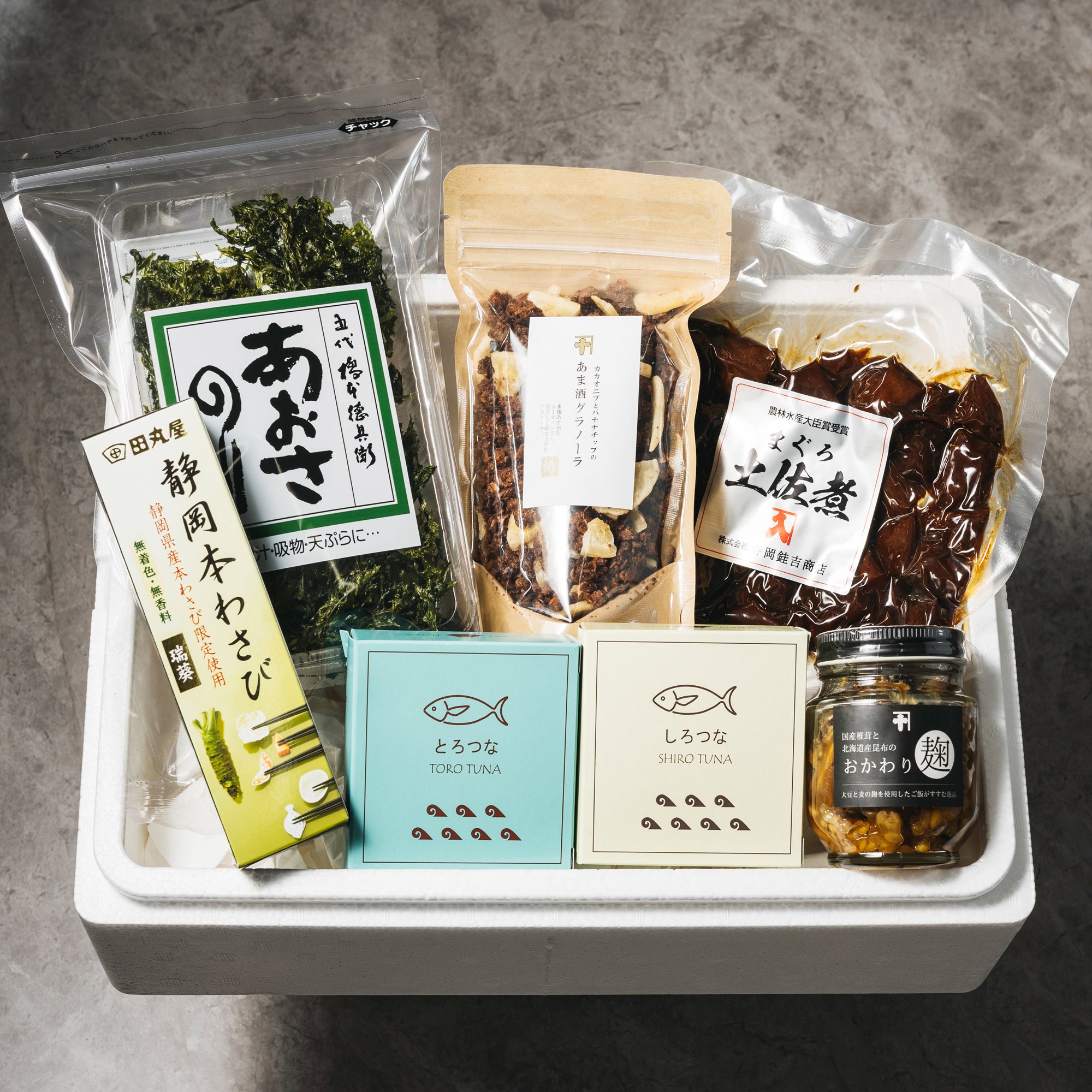 焼津港丸入商店の実店舗「波なれ」で使用しているさしみ醤油や本わさび、味噌汁の素を集めた厳選セット。